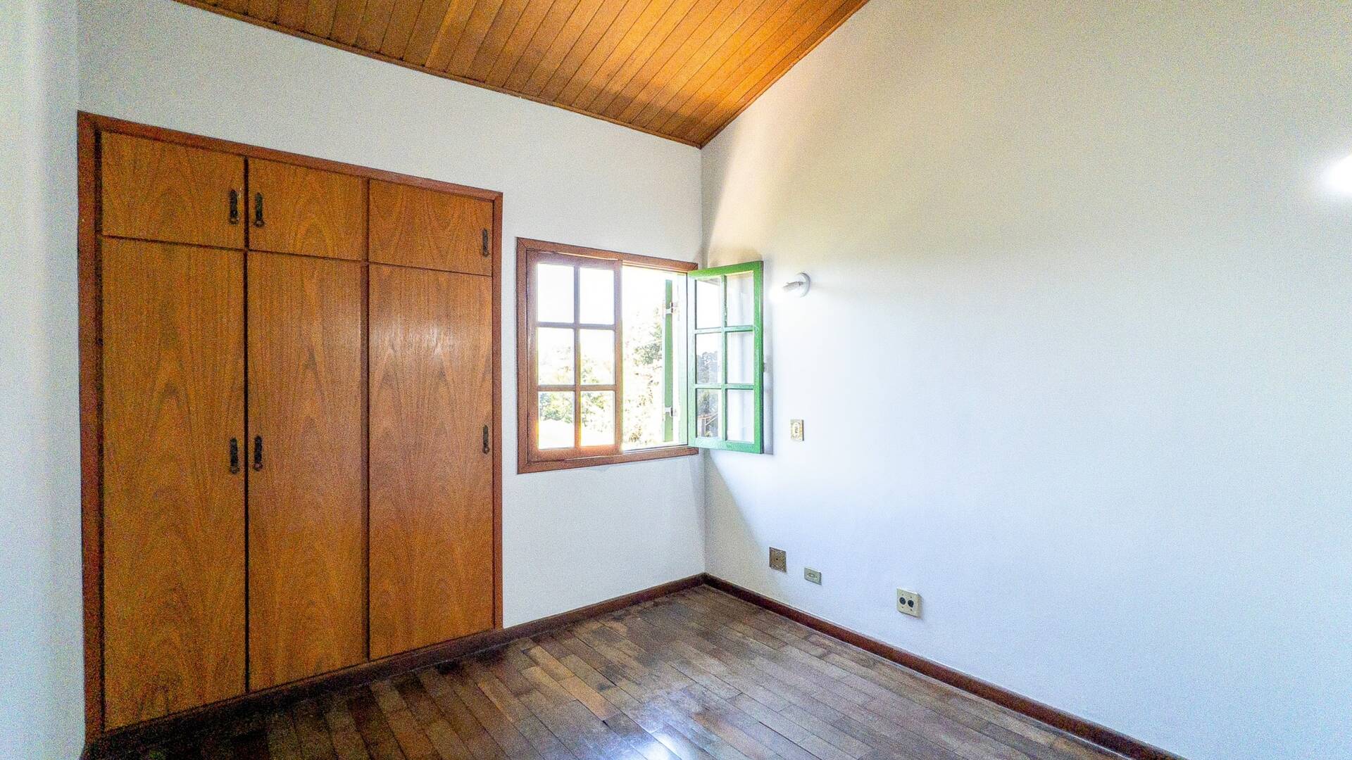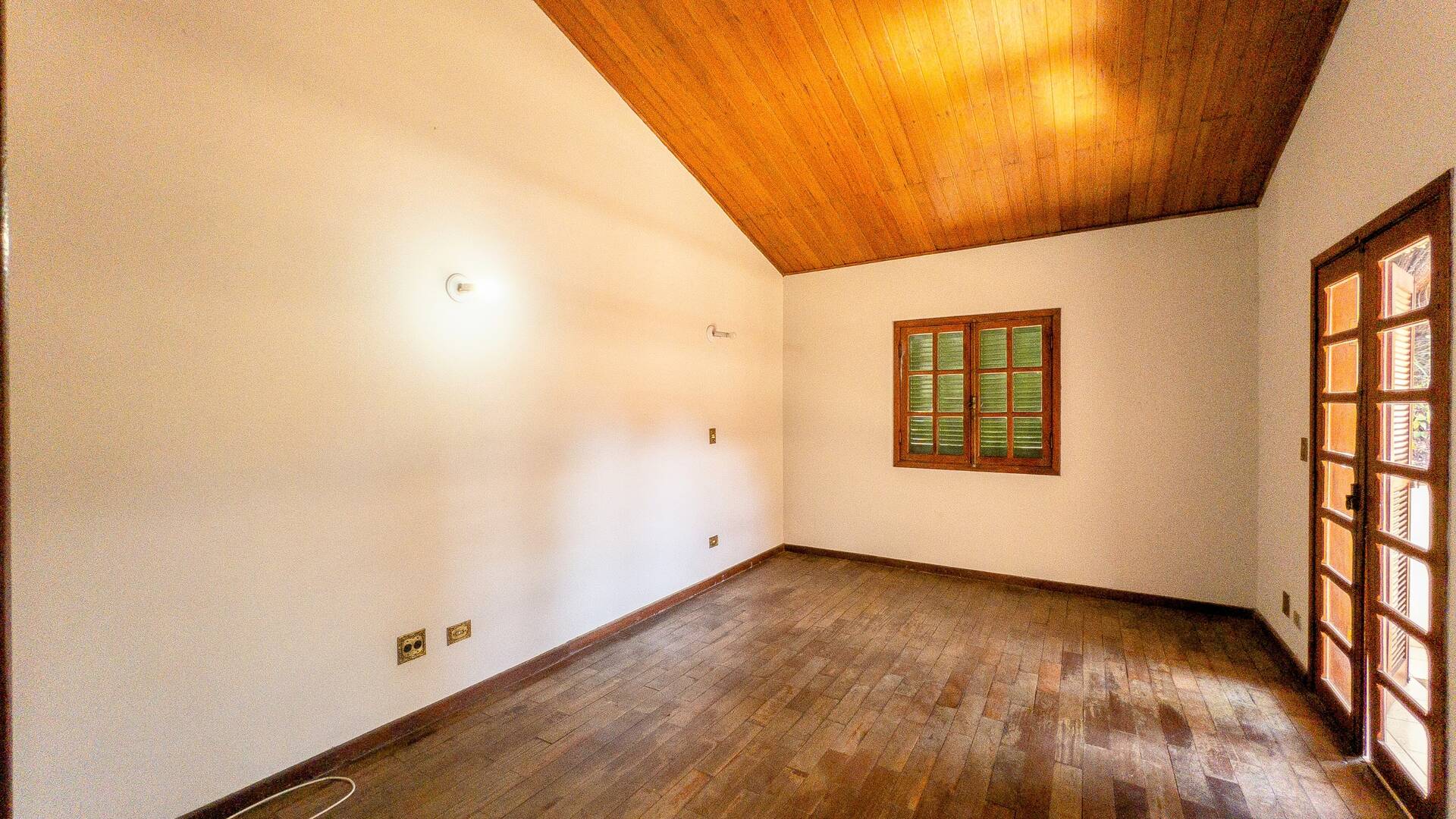 Casa de alto padrão Maison Vert estilo rústico com móveis planejados de madeira maciça tratada e arquitetura estilo chalé com telhado de madeira aparente.