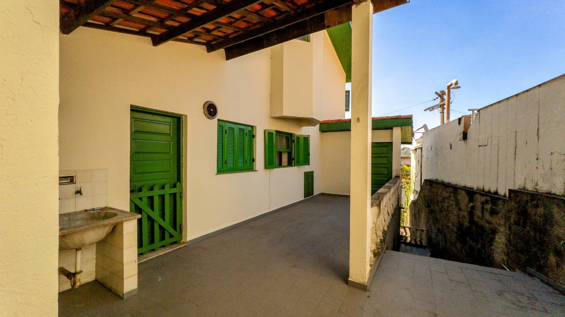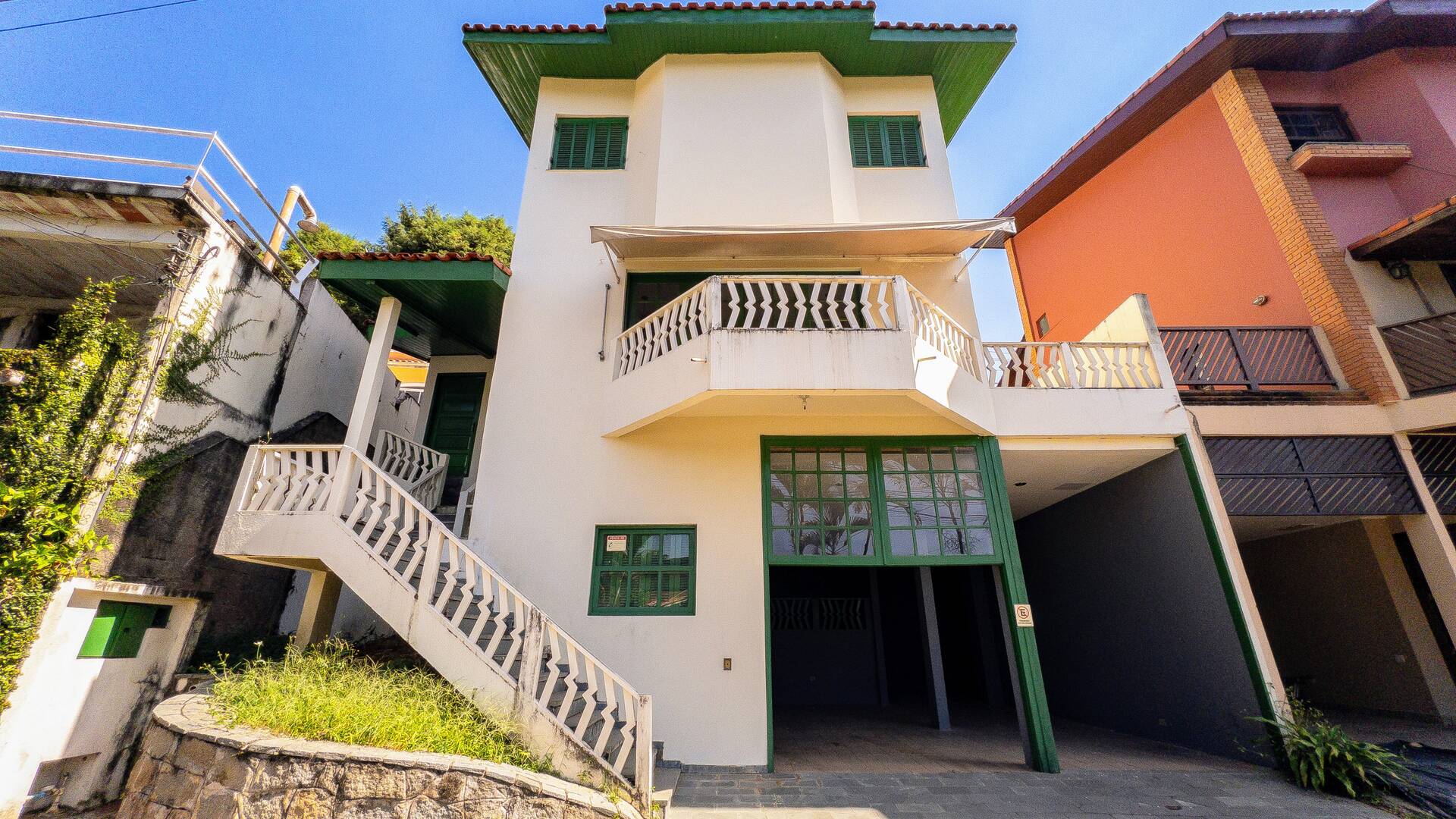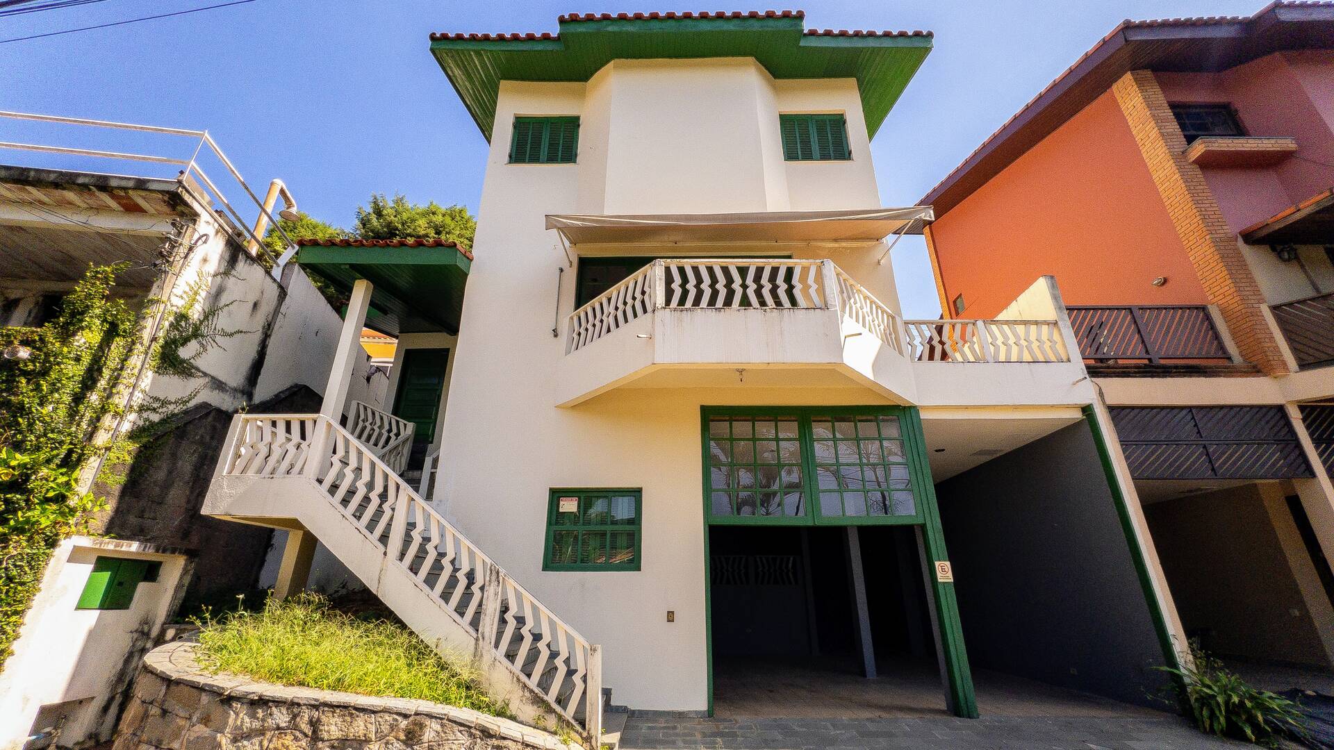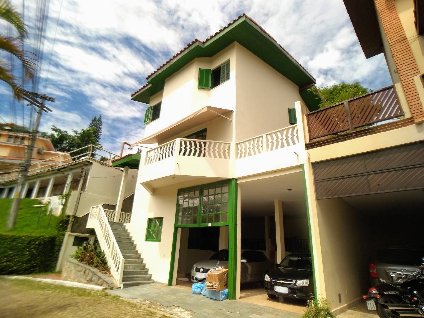 Vagas de garagem coberta para 4 carros e 3 motos, despensa e área de depósito, escada coberta para acesso à casa.