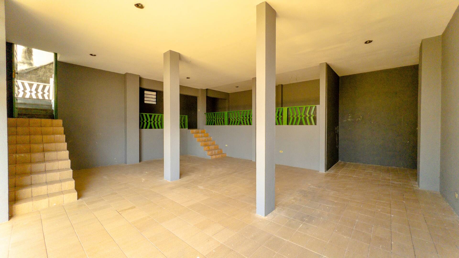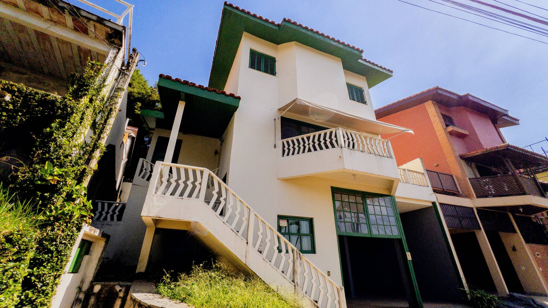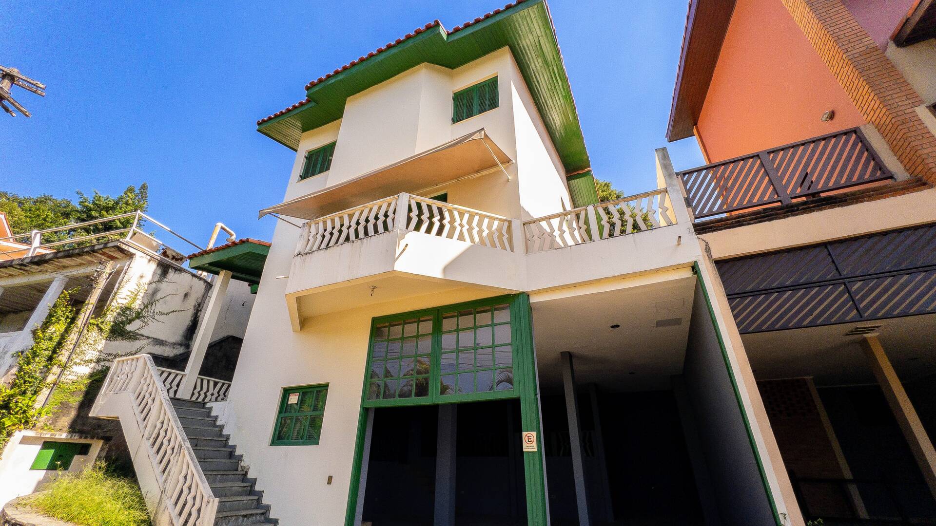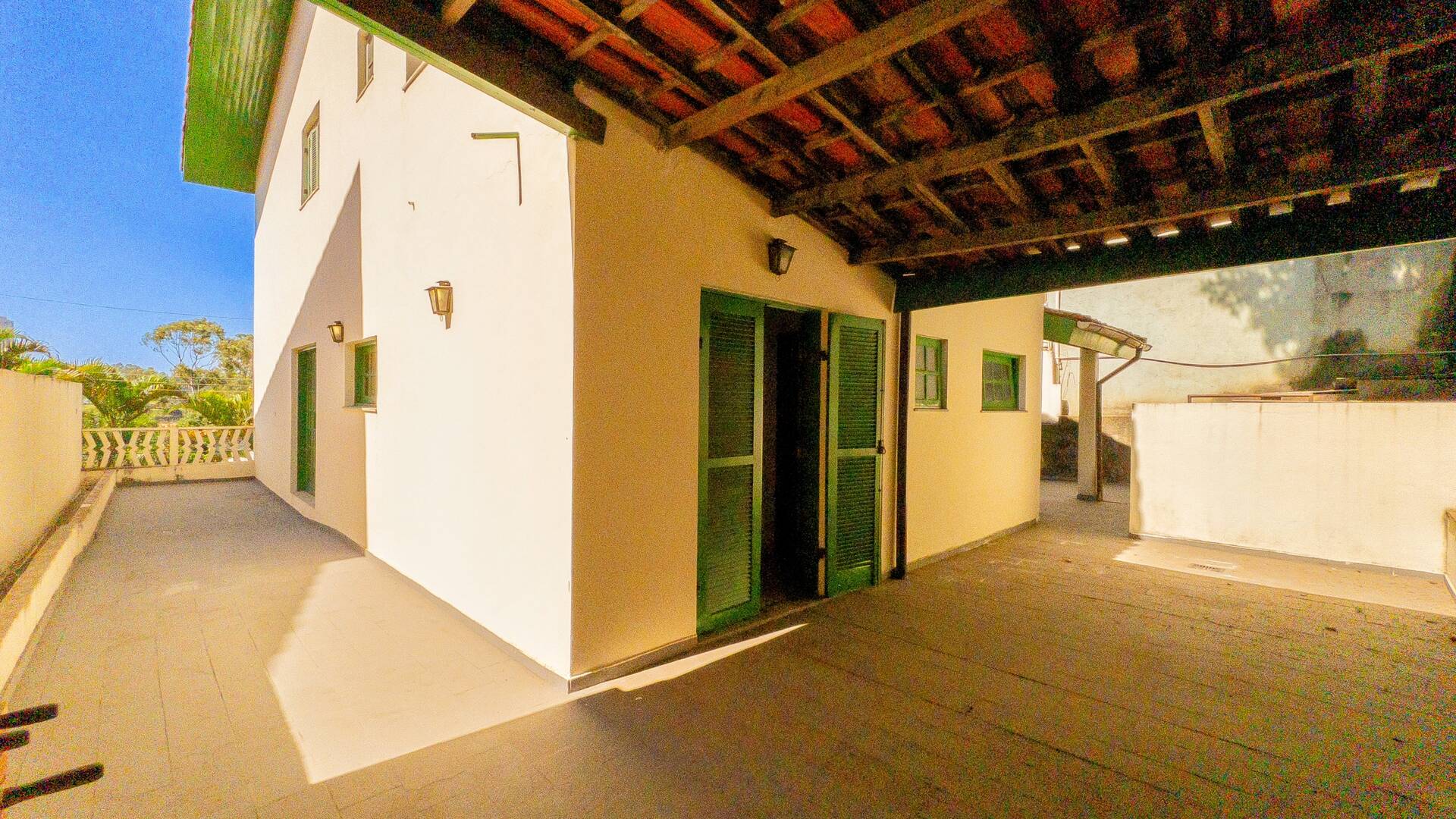 Vagas de garagem coberta para 4 carros e 3 motos, despensa e área de depósito, escada coberta para acesso à casa.